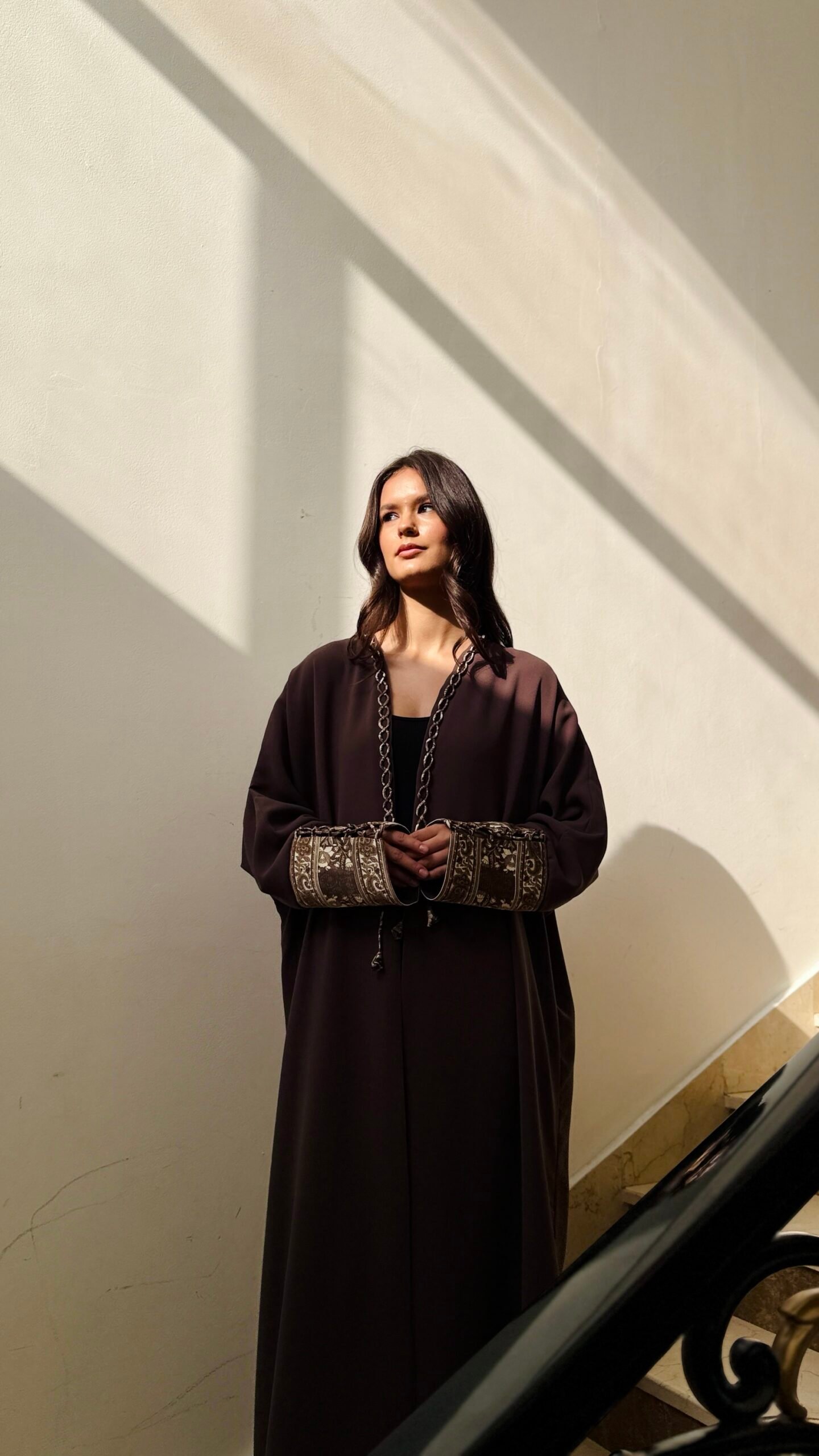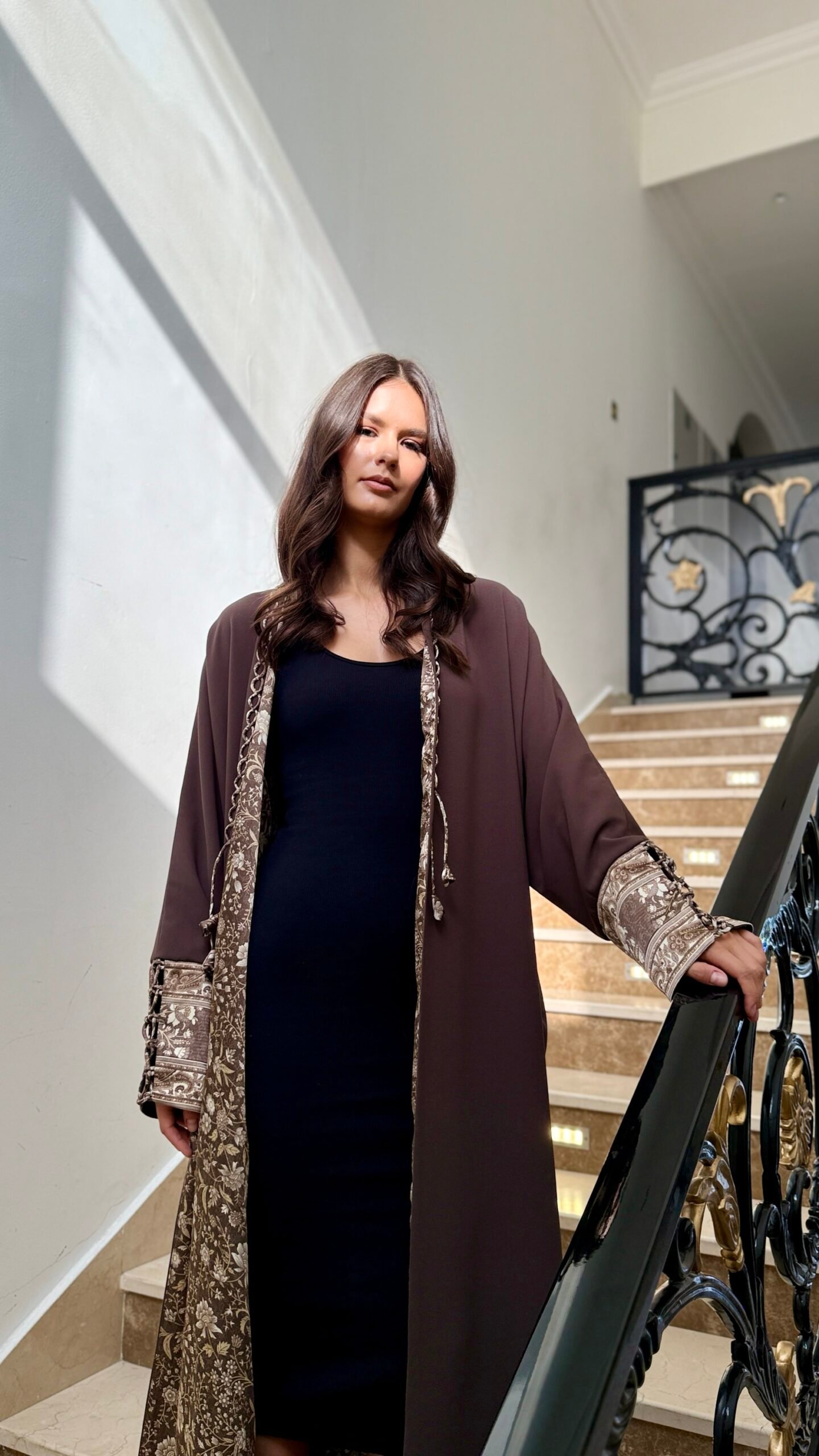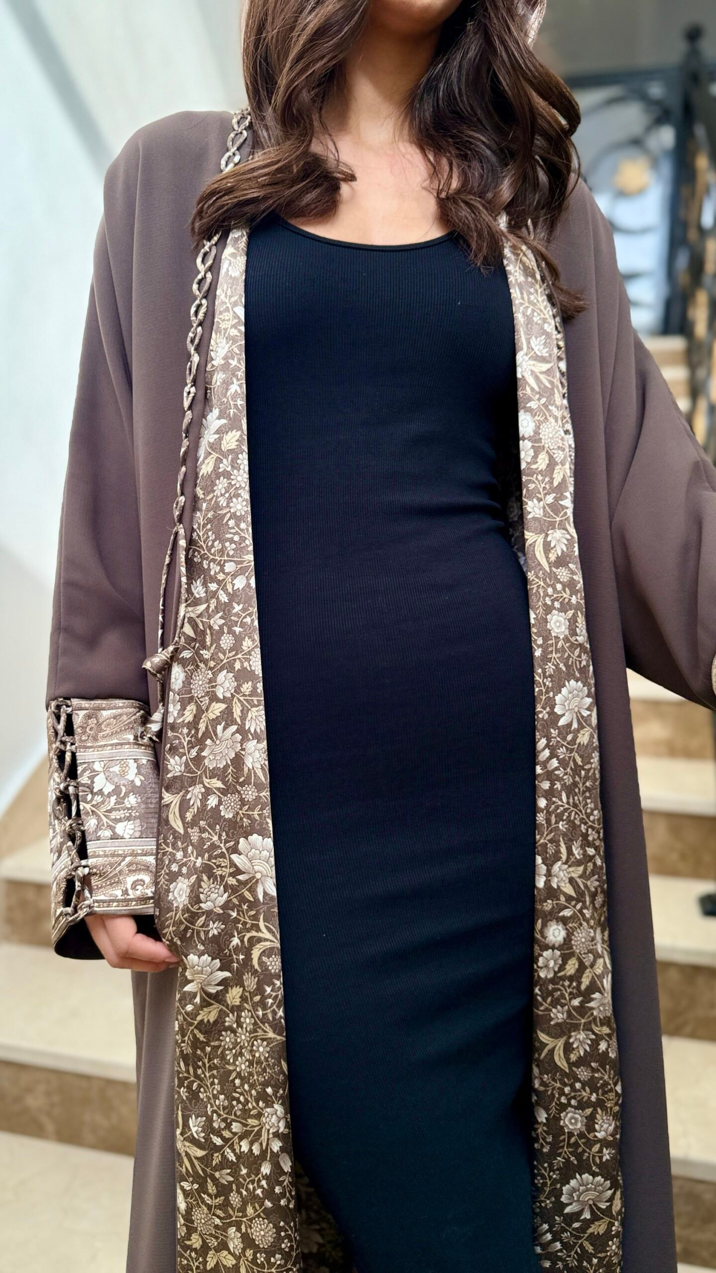 This brown abaya features a rich, earthy tone paired with printed fabric elements that add a soft touch of contrast and character. Designed with a relaxed silhouette and smooth, comfortable fabric, it offers effortless elegance that suits a variety of occasions—from casual outings to more refined gatherings. A versatile piece that blends modesty with timeless style.